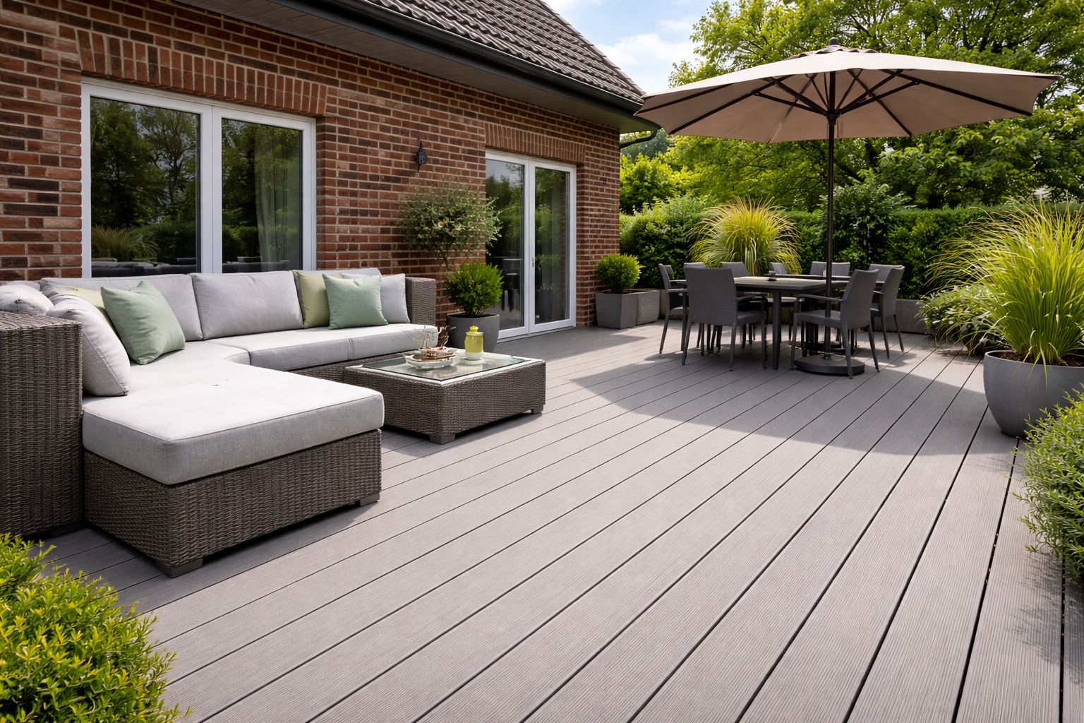 Zusätzlich zu unseren Fenster-, Tür- und Reparaturarbeiten planen und realisieren wir Terrassenflächen aus modernen Terrassen-Kunststoffdielen (Wood Plastic Composite – WPC). Dieses Material verbindet die natürliche Optik von Holz mit den Vorteilen von Kunststoff und eignet sich ideal für den Außenbereich.